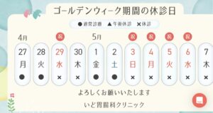 ゴールデンウィークの休診日は暦通りです。